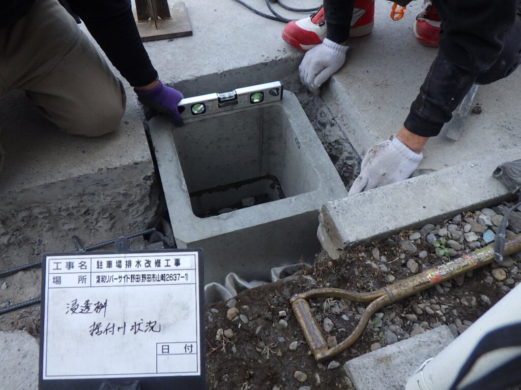 鉄骨階段出入り部前のスロープ状部分が外構に接続するところで凹みとなり、そこに水たまりができやすいとのご相談を受け、排水改修工事として排水溝と浸透桝を設置致しました。