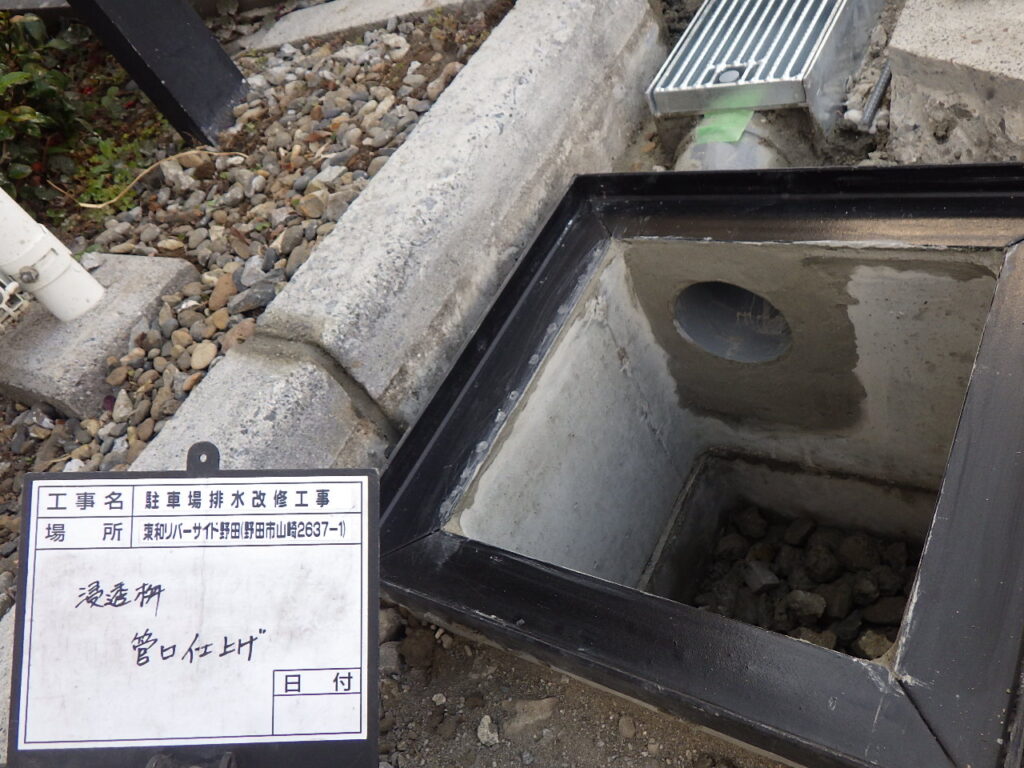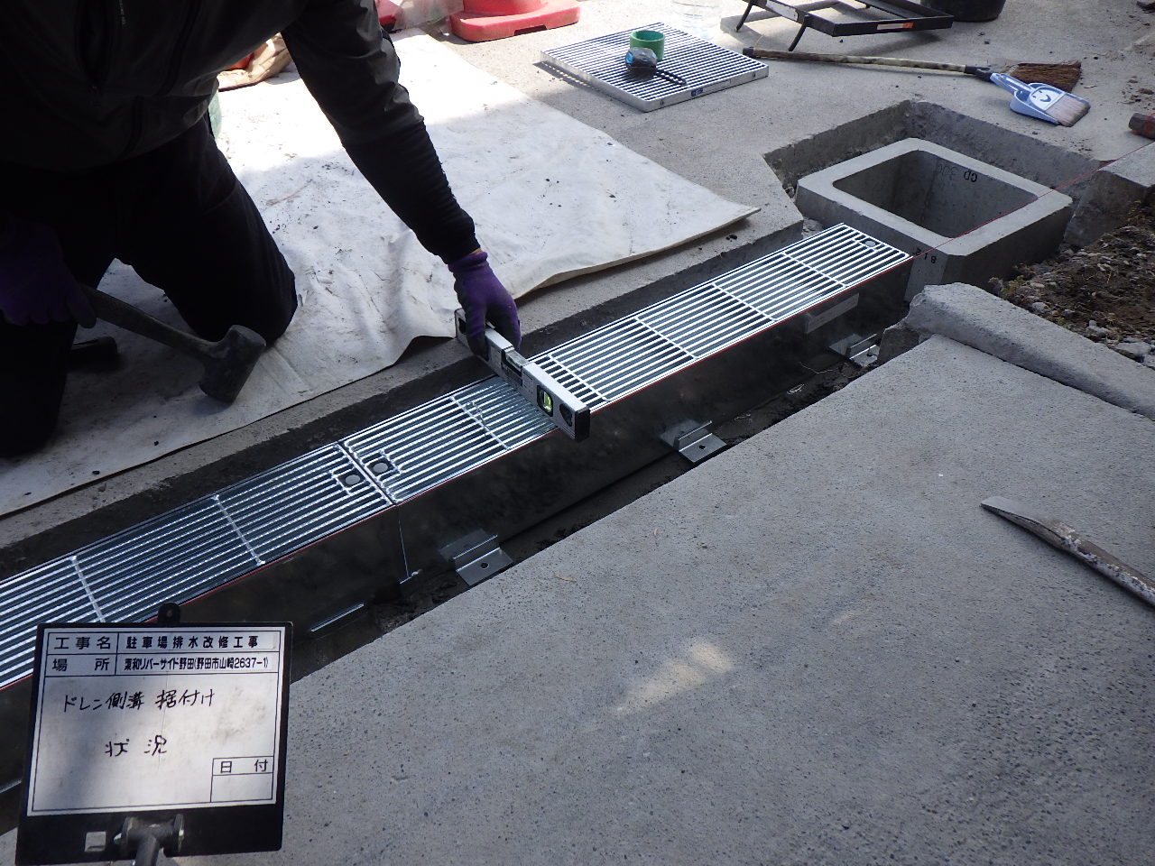 水たまりができる箇所にグレーチング付き排水溝を設け、更に浸透桝も設けてそれを接続することで、雨水を自然に地中へ浸透させるよう改修を致しました。