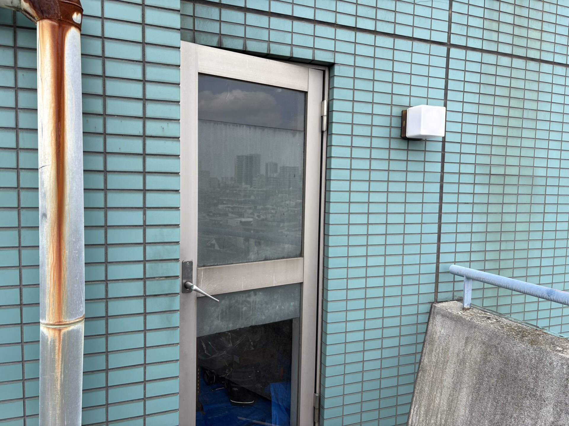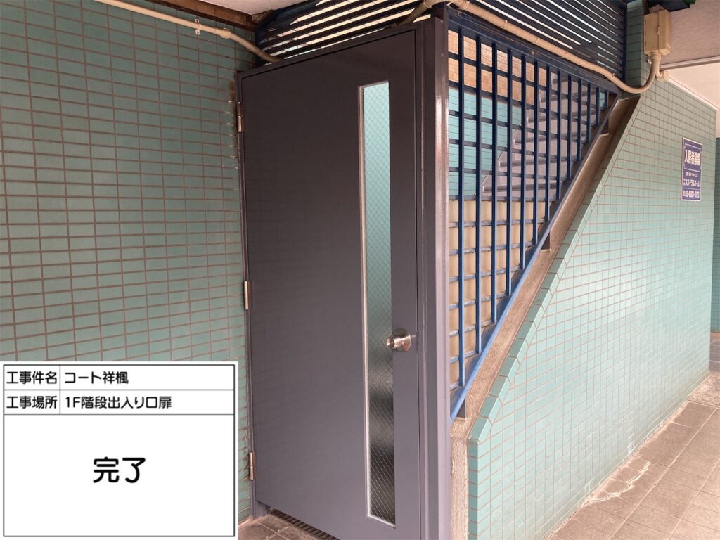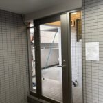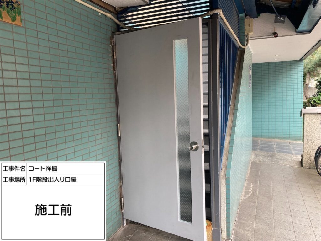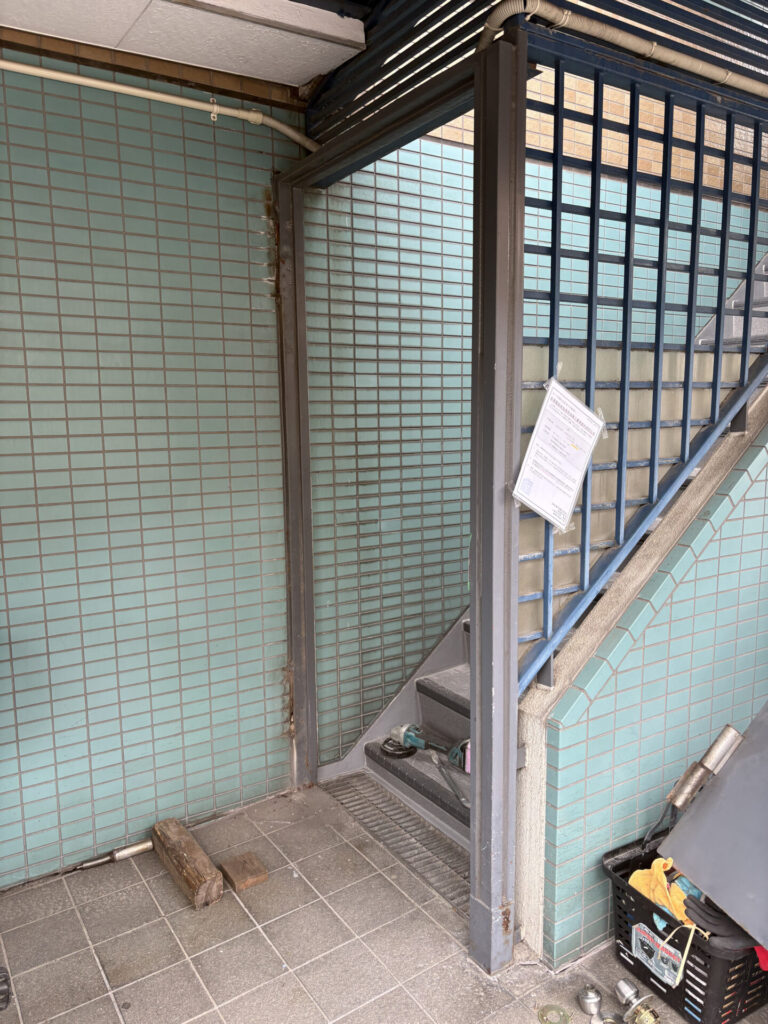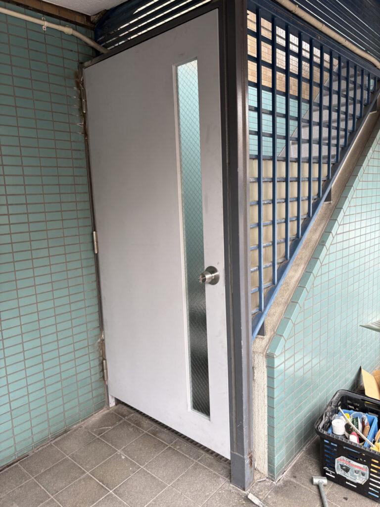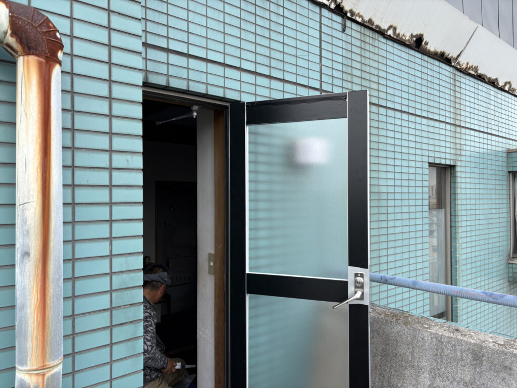 中野区の賃貸マンションのオーナー様からご依頼を頂き、屋上の防水工事と外部階段の床長尺シート貼り工事に加えて、開閉不具合が以前から生じていたバルコニーの出入口扉(アルミ製)と外部階段1階の鋼製扉交換工事を施工致しました。