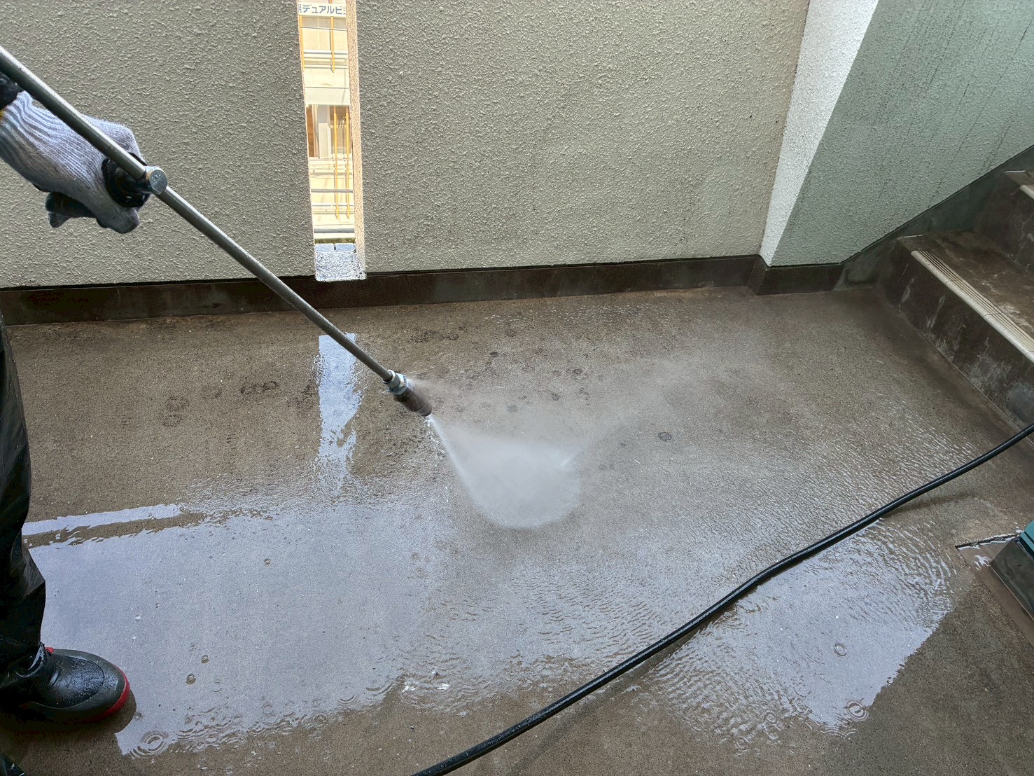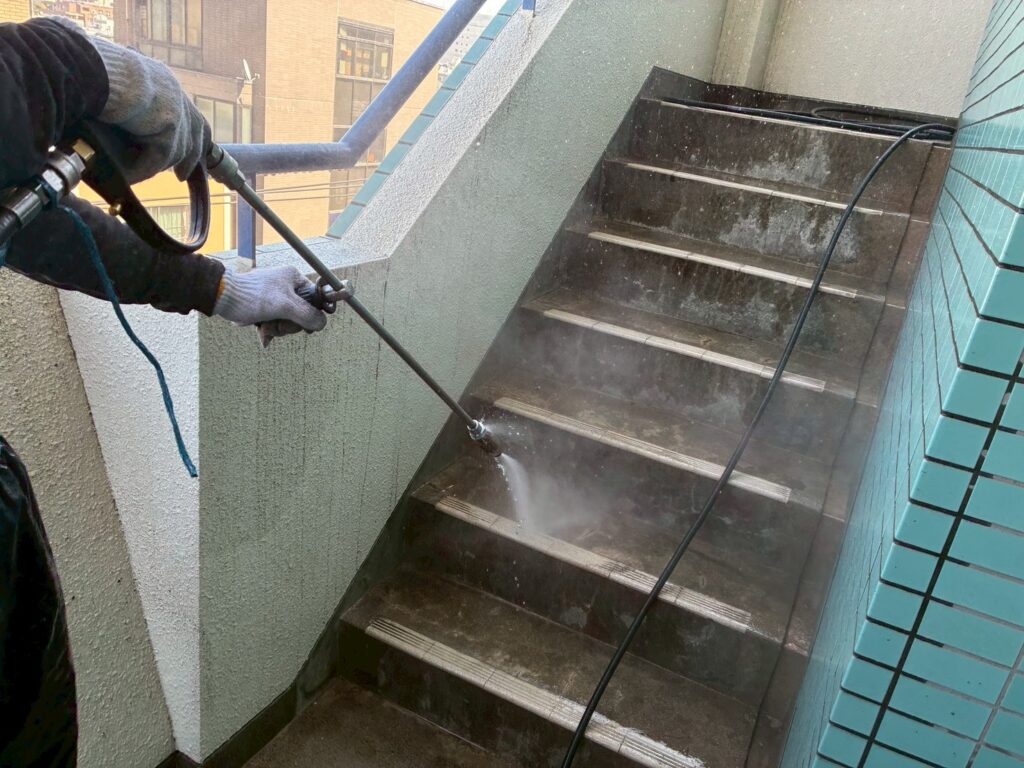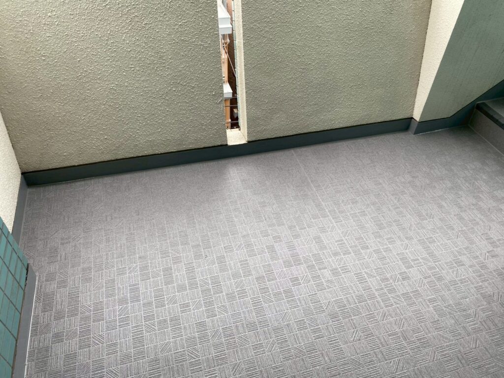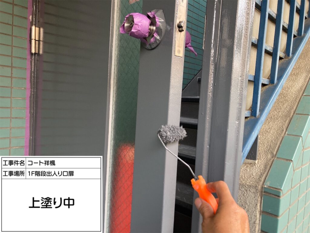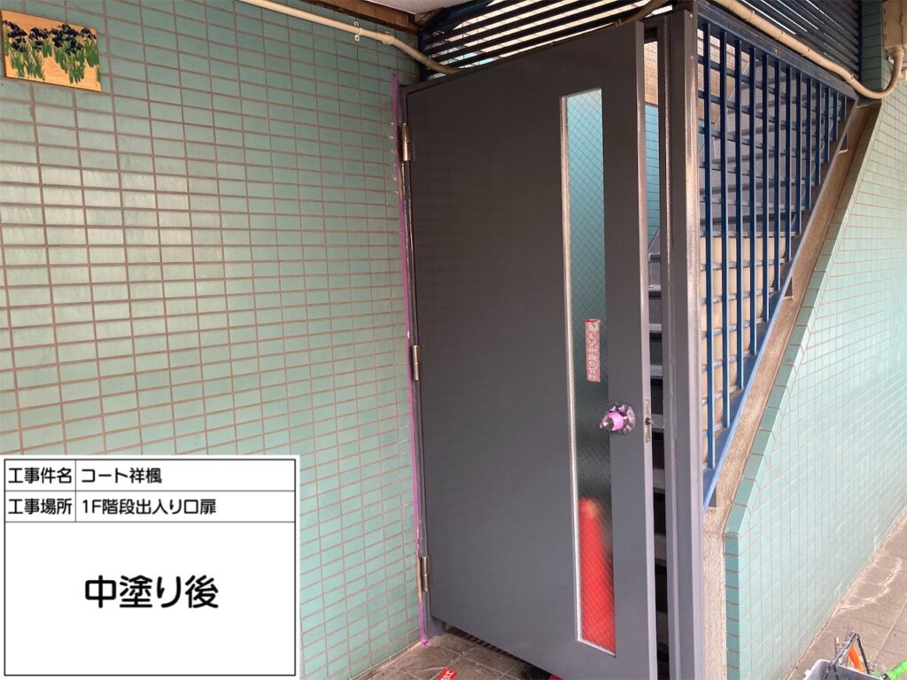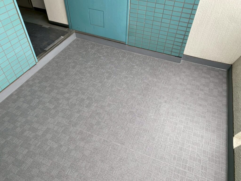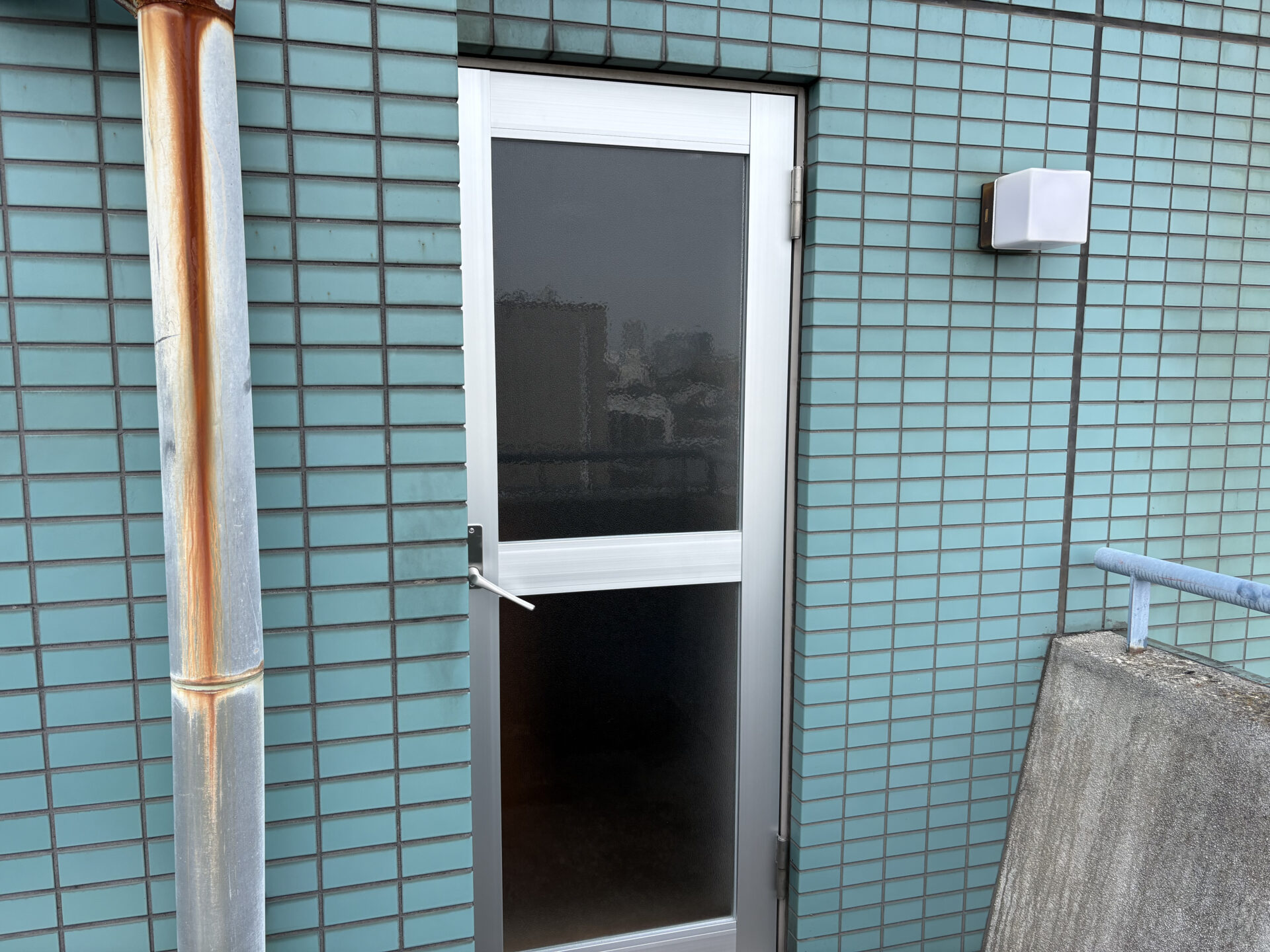 中野区の賃貸マンションのオーナー様からご依頼を頂き、屋上の防水工事と外部階段の床長尺シート貼り工事に加えて、開閉不具合が以前から生じていたバルコニーの出入口扉(アルミ製)と外部階段1階の鋼製扉交換工事を施工致しました。