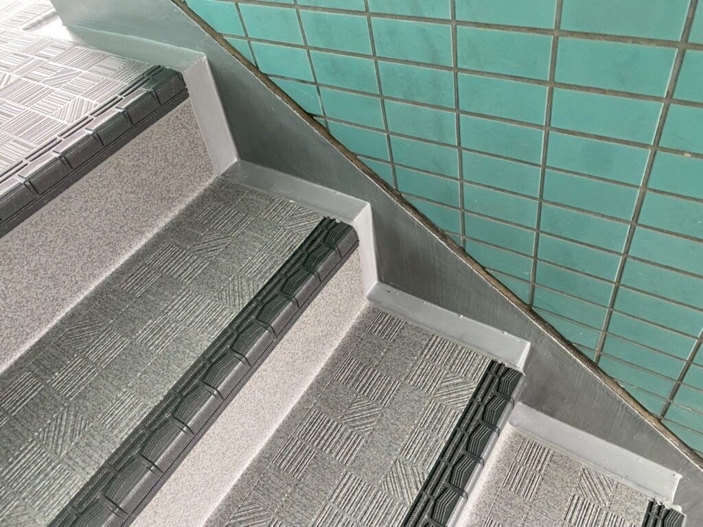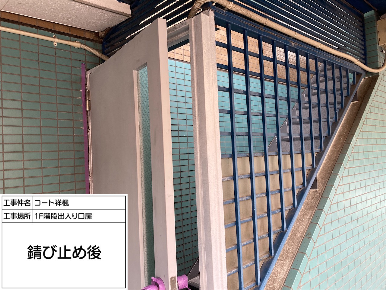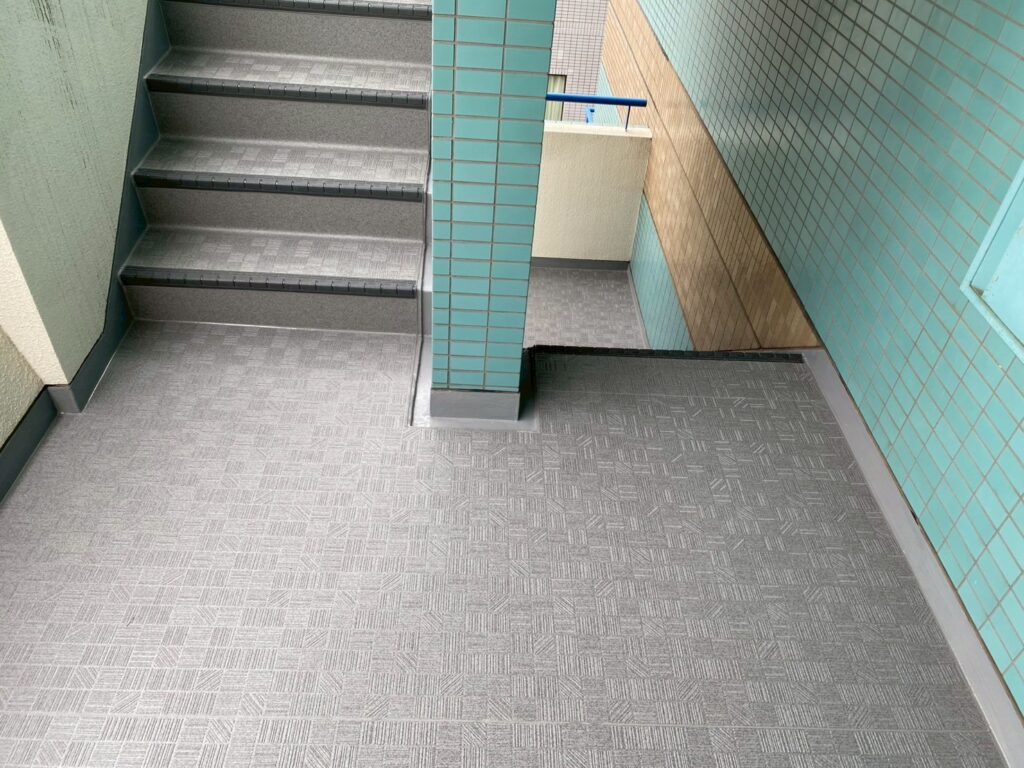 屋上防水(屋上鉄部塗装あり)、階段床シート貼り、扉の交換工事
